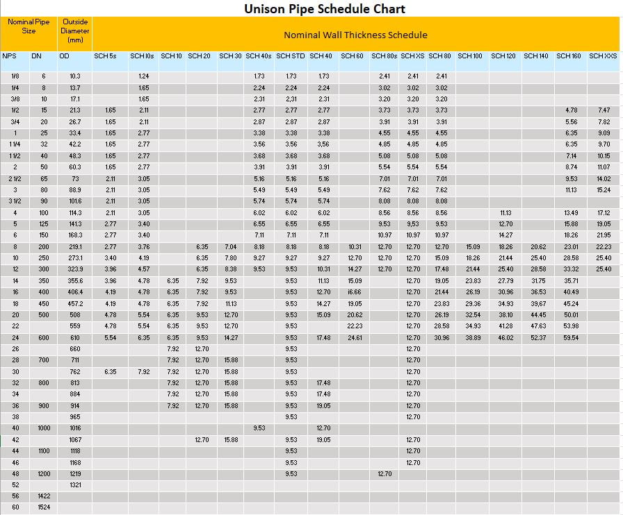 Pipe diameter refers to a nominal diameter- not actual. Pipe Schedule (see example, right) refers to the pipe’s wall thickness. The actual physical outside diameter is larger than it’s nominal OD.